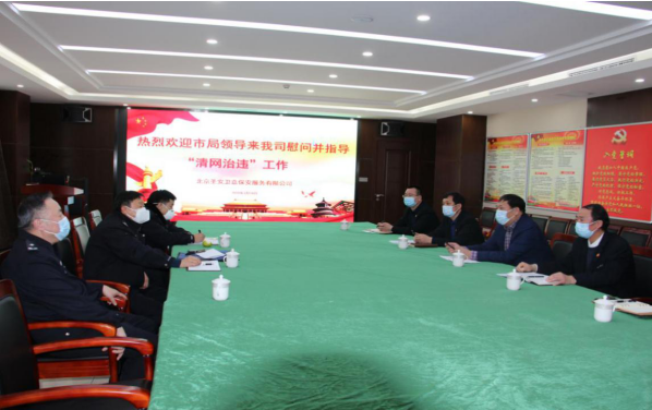 2020年3月18日下午15:00,北京市局治安管理总队赵支队长,大兴分局治安管理中队关队长等领导一行到我公司检查“清网行动”落实情况,并送来疫情防护品。对我公司疫情期间的工作给予肯定的同时,对下一阶段相关工作做出重要指示。