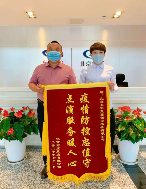 2020年7月1日北京亦庄置业有限公司为感谢北京圣安卫嘉保安服务有限公司驻北工大软件园项目在疫情期间的突出表现特地送来锦旗。